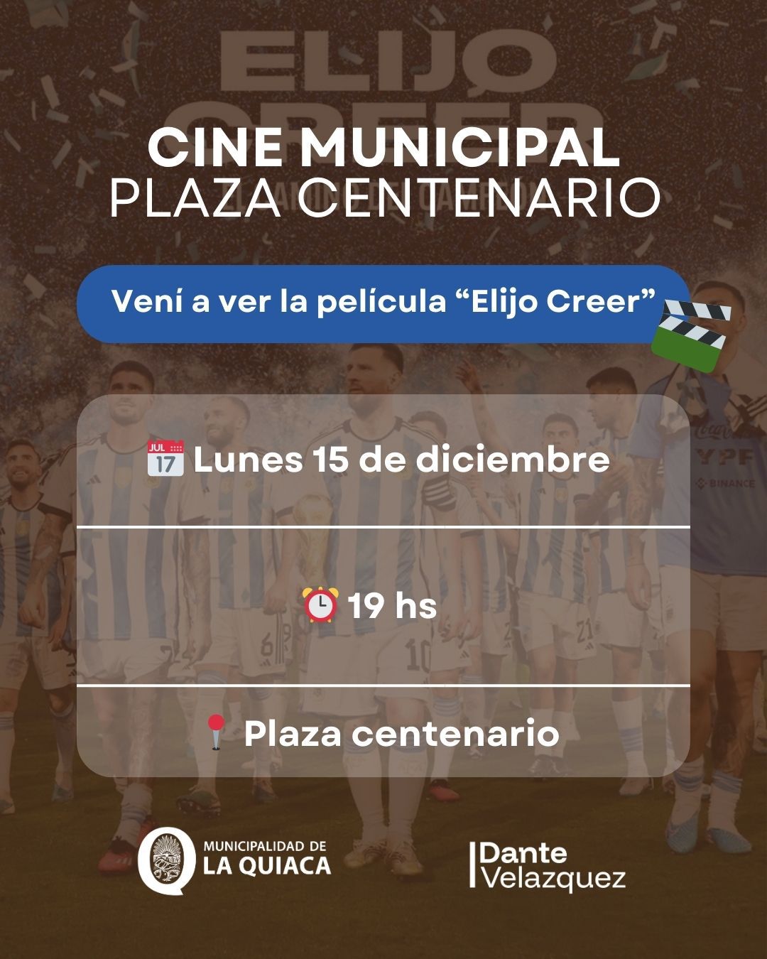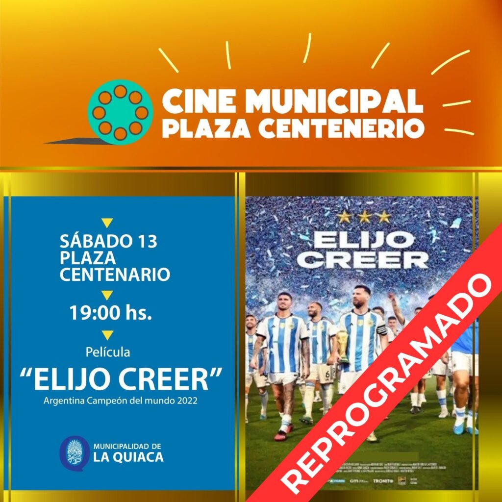 Desde la organización se informó que la función prevista para el día de hoy de Elijo Creer, el film que revive la histórica consagración de la Selección Argentina en el Mundial de Qatar 2022, fue reprogramada para el lunes 15 de diciembre, a fin de que más vecinos puedan participar de esta propuesta cargada de emoción y orgullo nacional.