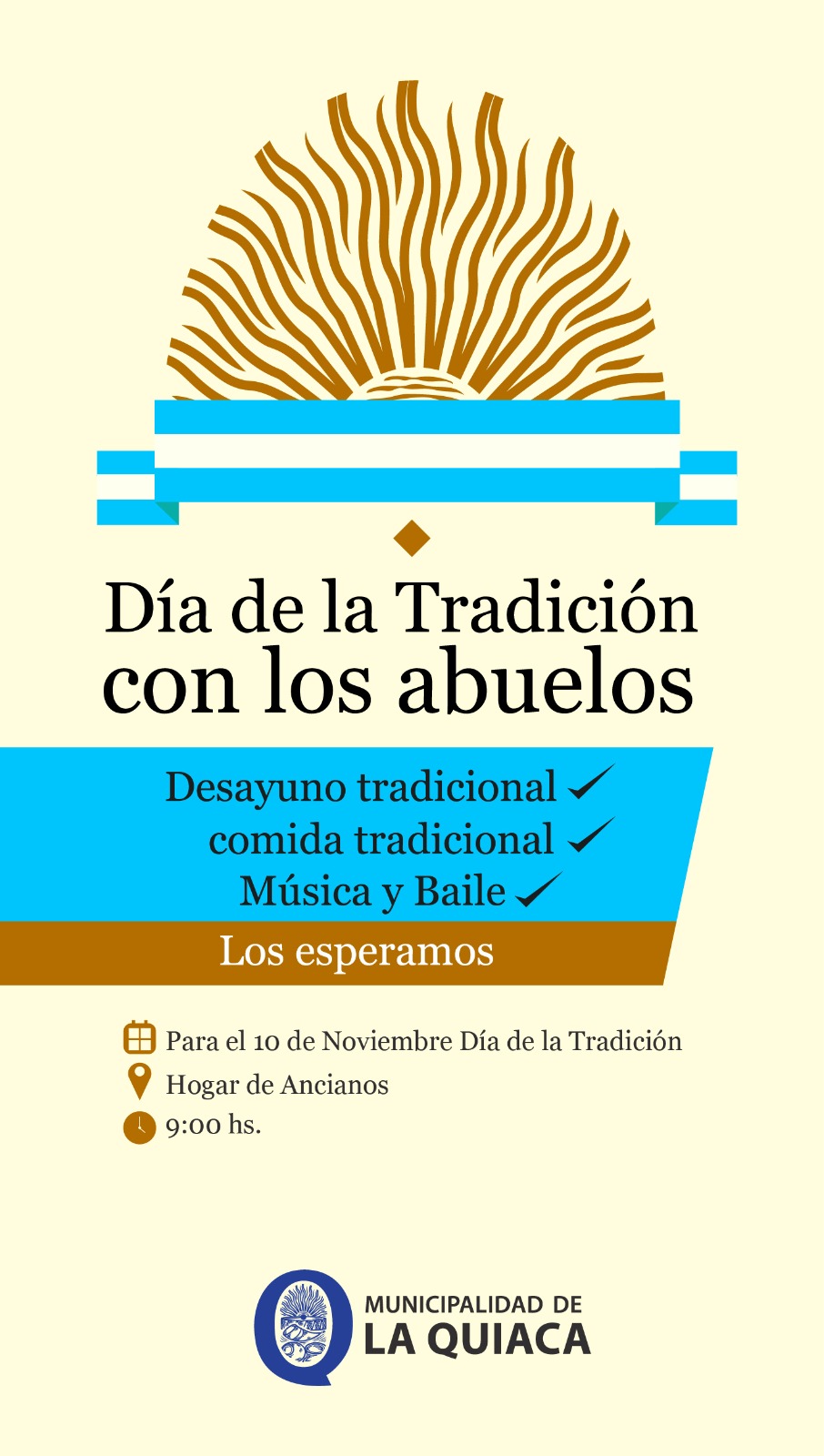 La Municipalidad de La Quiaca, celebrará el Día de la Tradición con una jornada muy especial dedicada a los abuelos del Hogar de Ancianos, el próximo 10 de noviembre a las 9:00 hs. La propuesta busca compartir y revalorizar nuestras costumbres a través de un encuentro lleno de afecto y tradiciones que nos unen como comunidad.