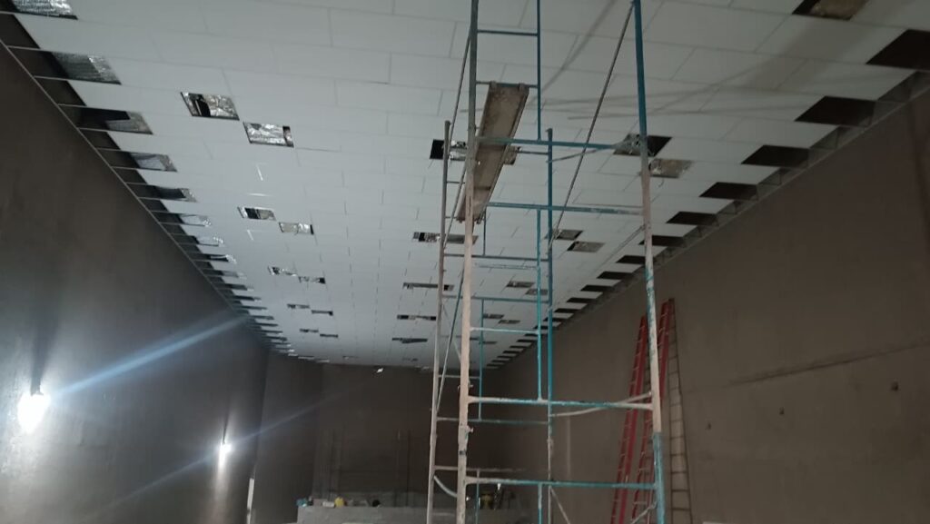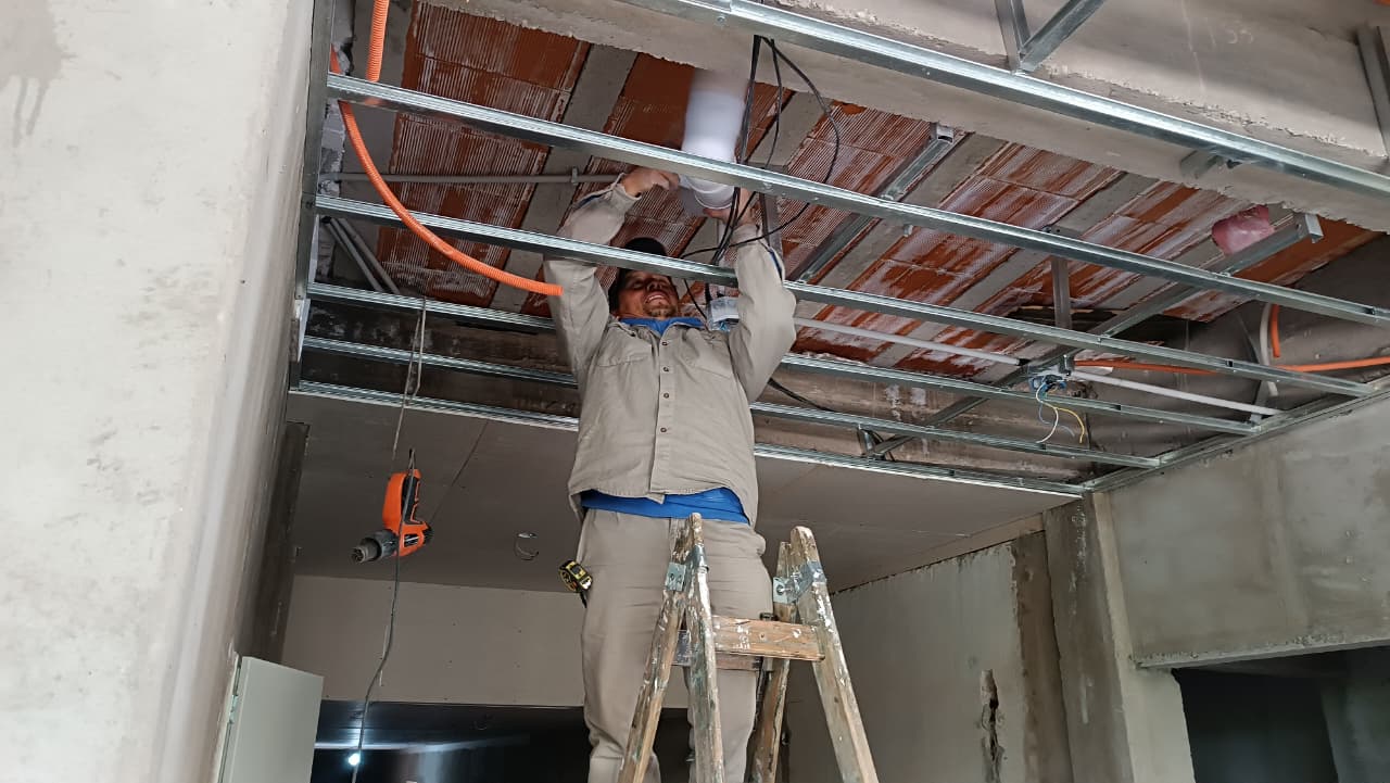 En paralelo, la obra presenta un importante avance en la instalación eléctrica básica, junto con la colocación de algunos artefactos, y continúa el desarrollo del cielorraso, los premarcos y las terminaciones generales.