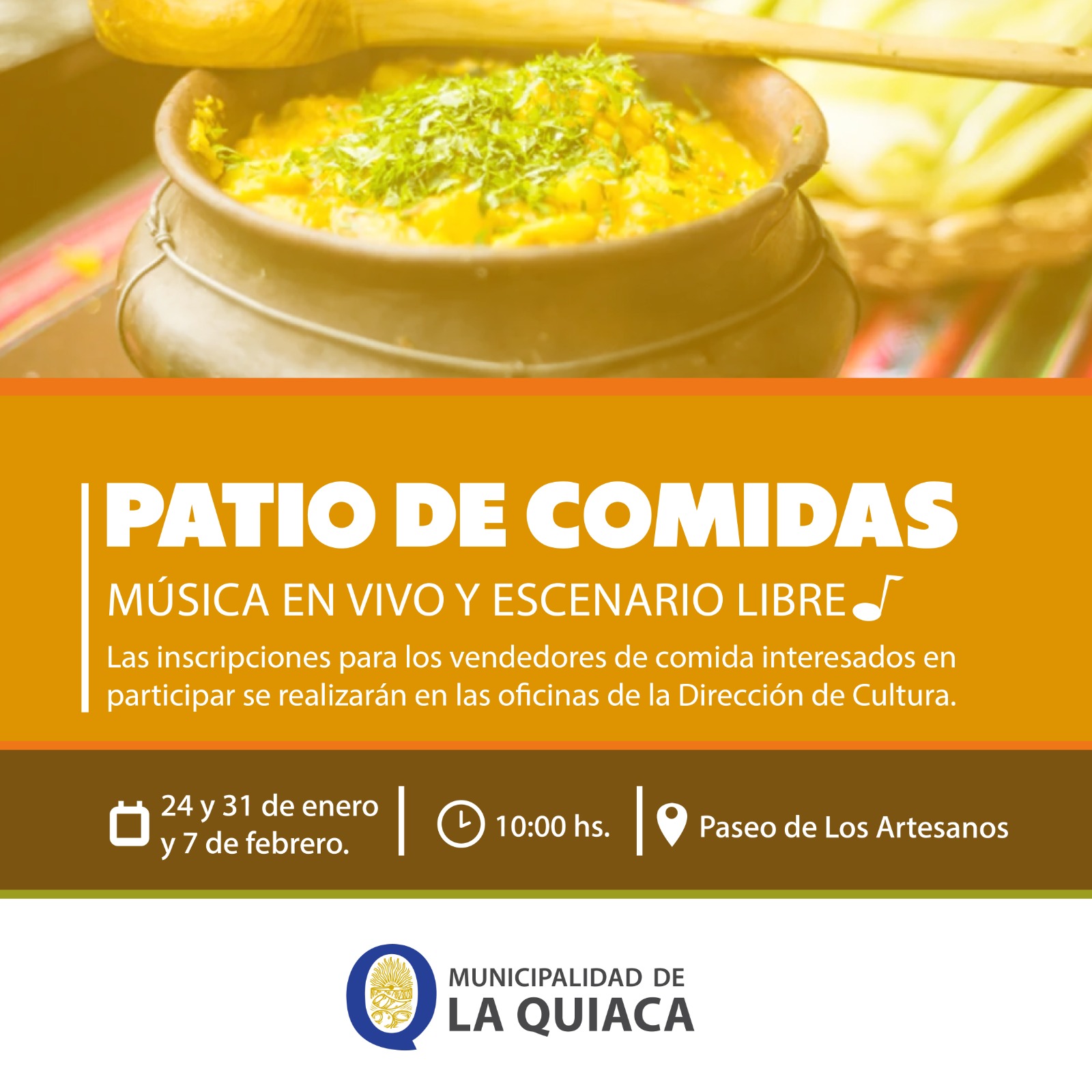 La Municipalidad de La Quiaca, a través de la Secretaría de Cultura y Turismo, invita a la comunidad a participar del patio de comidas “Sabores de mi Tierra”, que se realizará mañana sábado 24, en el Paseo de los Artesanos, a partir de las 10:00 de la mañana. La iniciativa busca promover la gastronomía local, acompañar a los artesanos y ofrecer un espacio de encuentro para vecinos y visitantes.
