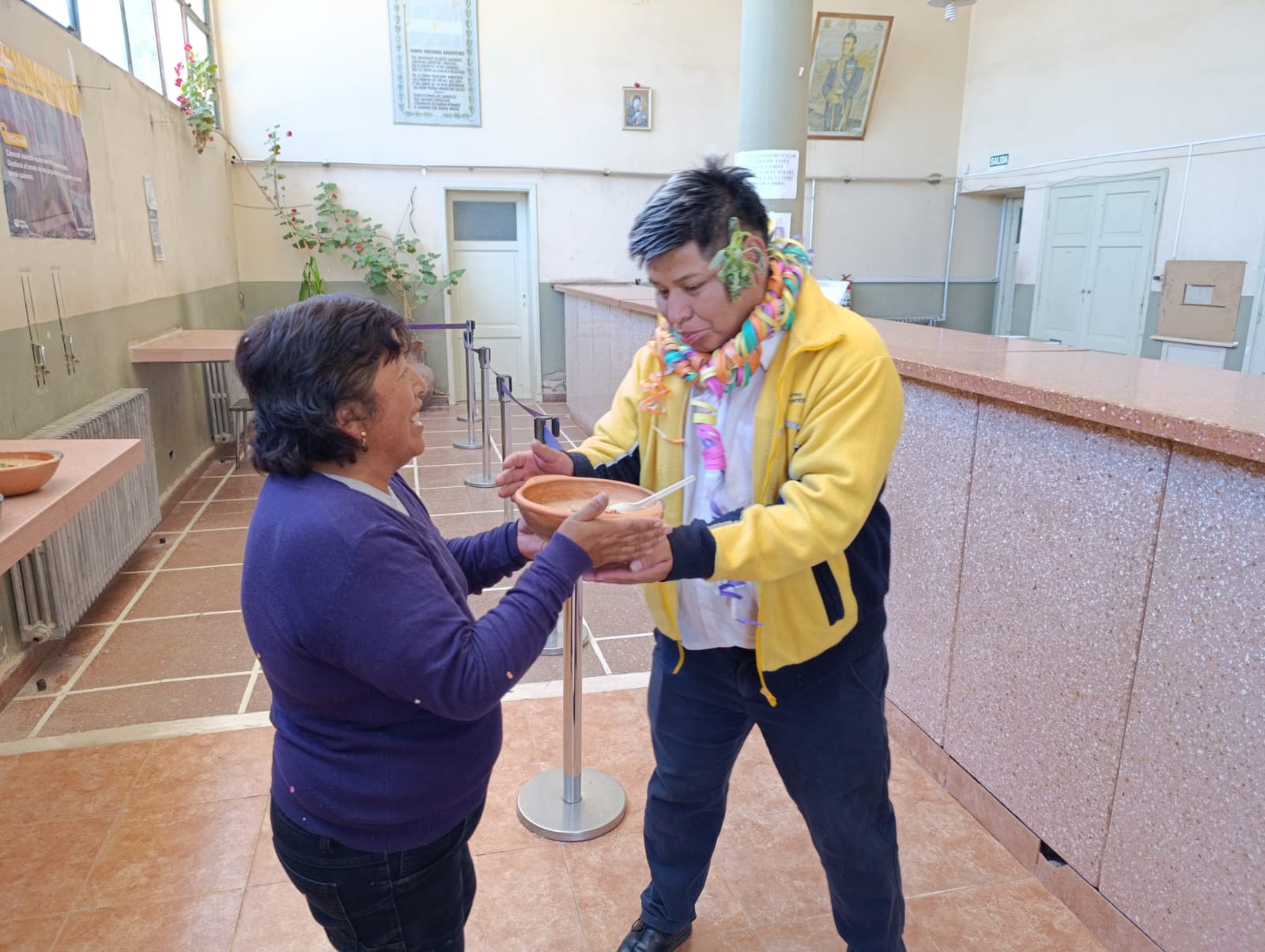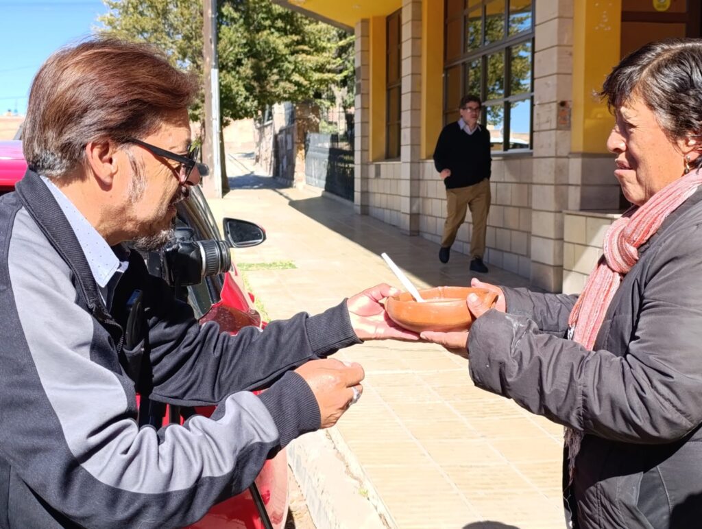 Durante cada visita, los compadres fueron recibidos con los elementos tradicionales del carnaval y compartieron un plato de lagua junto a un vaso de chicha, comidas típicas que forman parte de la celebración.