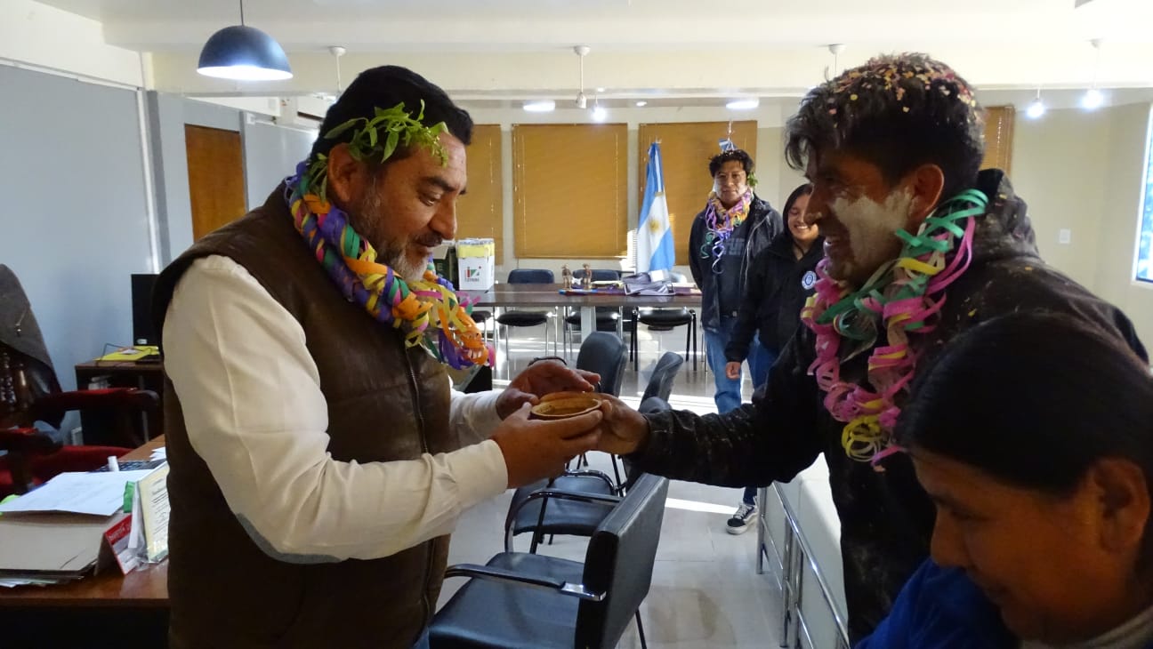 Desde tempranas horas, el área de Cultura y Turismo comenzó el agasajo visitando al intendente Dante Velazquez en su despacho municipal, donde junto a su equipo de trabajo compartieron el espíritu festivo entre albaca, serpentina, papel picado y talco, elementos característicos de esta tradición popular.