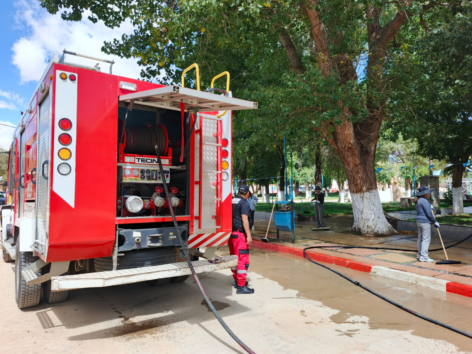 El Tëcnico Saúl Garzón agradeció especialmente la colaboración del cuerpo de Bomberos, que facilitó un camión hidrante para reforzar la limpieza. “Como todas las áreas están abocadas a distintos trabajos y nuestros equipos estaban ocupados, solicitamos el acompañamiento al Jefe, quien muy amablemente puso a disposición el camión para avanzar con esta limpieza general”, explicó.