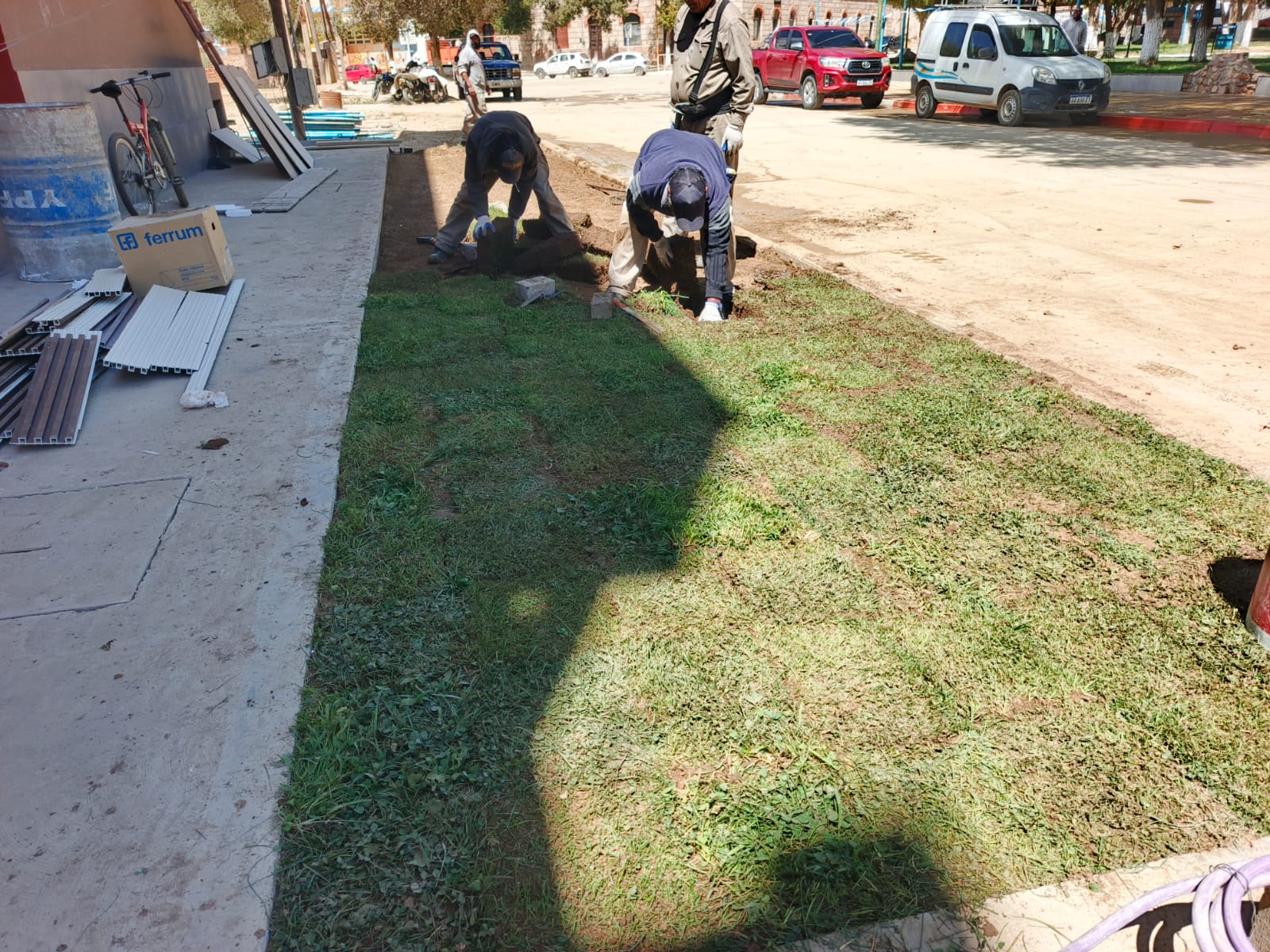 En simultáneo, sobre la vereda del Complejo Cultural, el personal municipal avanzó con la colocación de césped y plantas ornamentales para mejorar la estética del sector. El nuevo espacio verde complementa la estructura de cemento y aporta una imagen renovada al entorno, que será uno de los puntos centrales de la celebración.