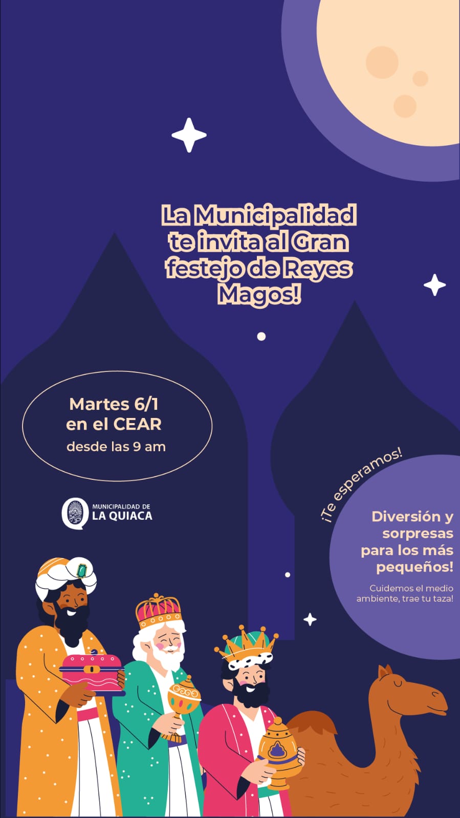La Municipalidad de La Quiaca, llevará adelante mañana martes 6 de enero un gran festejo por la llegada de los Reyes Magos, destinado a todos los niños de la ciudad. La actividad se desarrollará desde las 09:00 horas en el Centro de Alto Rendimiento (CEAR), con una propuesta integral que incluirá juegos, espectáculos, sorteos y entrega de regalos.