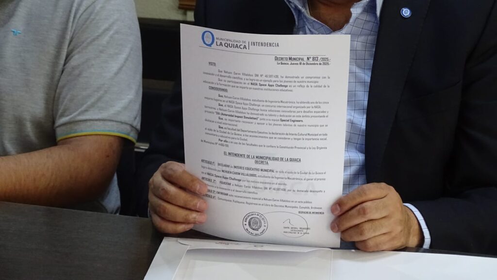 Velazquez remarcó que el logro trasciende lo individual y se convierte en un mensaje colectivo. “Este reconocimiento no es sólo para Nehuen, sino para todos los chicos y chicas de La Quiaca y de Jujuy. El talento está en nuestra tierra; lo que se necesita es acompañamiento, oportunidades y un Estado presente. Cuando un joven de nuestra ciudad compite de igual a igual con el mundo, toda La Quiaca avanza”.