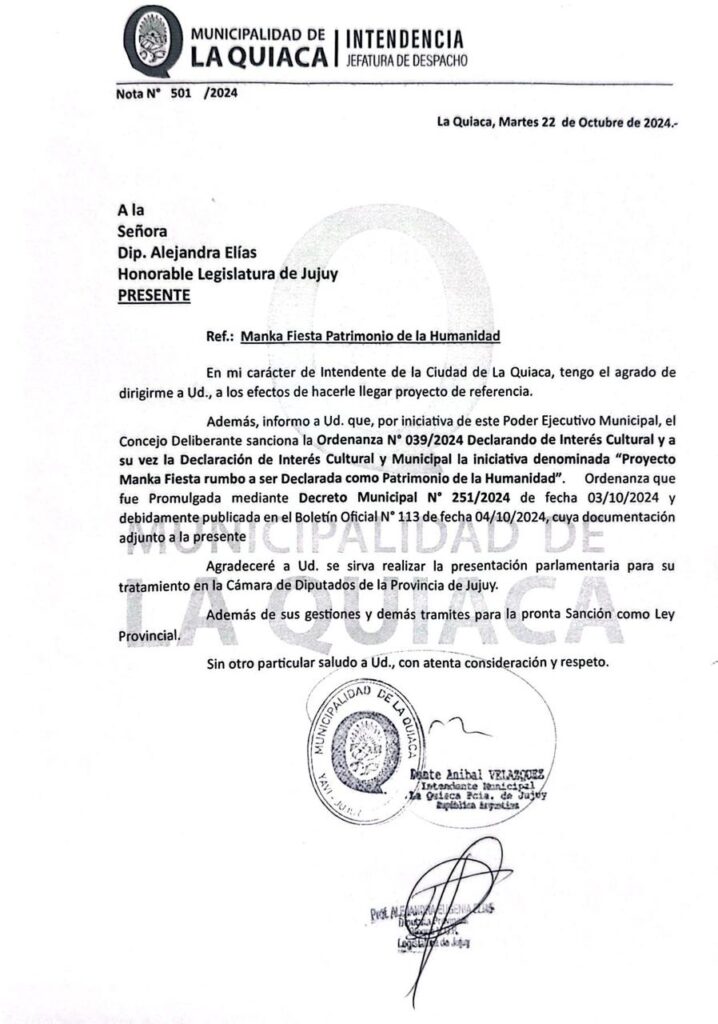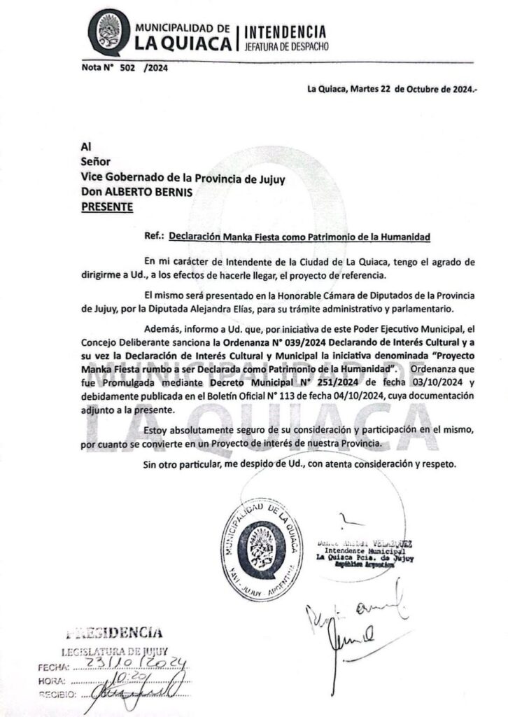 PRESENTACIÓN EN LA LEGISLATURA PROVINCIAL DEL PROYECTO “MANKA FIESTA, RUMBO A SER DECLARADA PATRIMONIO DE LA HUMANIDAD”