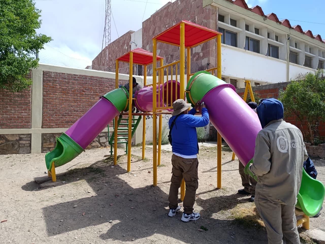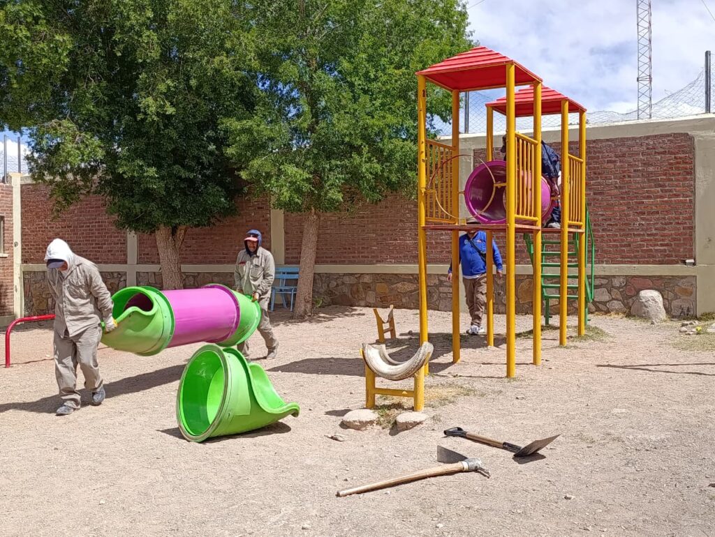 La Municipalidad de La Quiaca inició hoy trabajos en la Escuela Primaria Normal, a raíz de un pedido presentado por la institución para mejorar el espacio del parquecito infantil. La directora, profesora Luisa Sotar, explicó que la solicitud surgió ante la necesidad de contar con un lugar más seguro y adecuado para los alumnos.